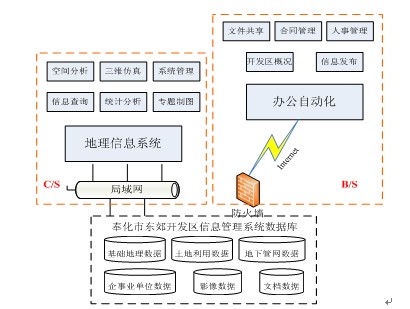 C/S面向工業園內部用戶,實現基于GIS的高級應用,B/S同時面向工業園內部用戶和Internet上的大眾用戶,實現辦公自動化功能,二者共享同一數據庫。