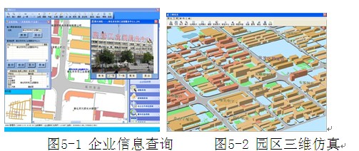 工業園地理信息系統目前已經開發完成并投入使用,系統運行穩定。圖5-1所示為系統企業信息查詢界面,圖5-2所示為園區三維仿真模塊運行界面。